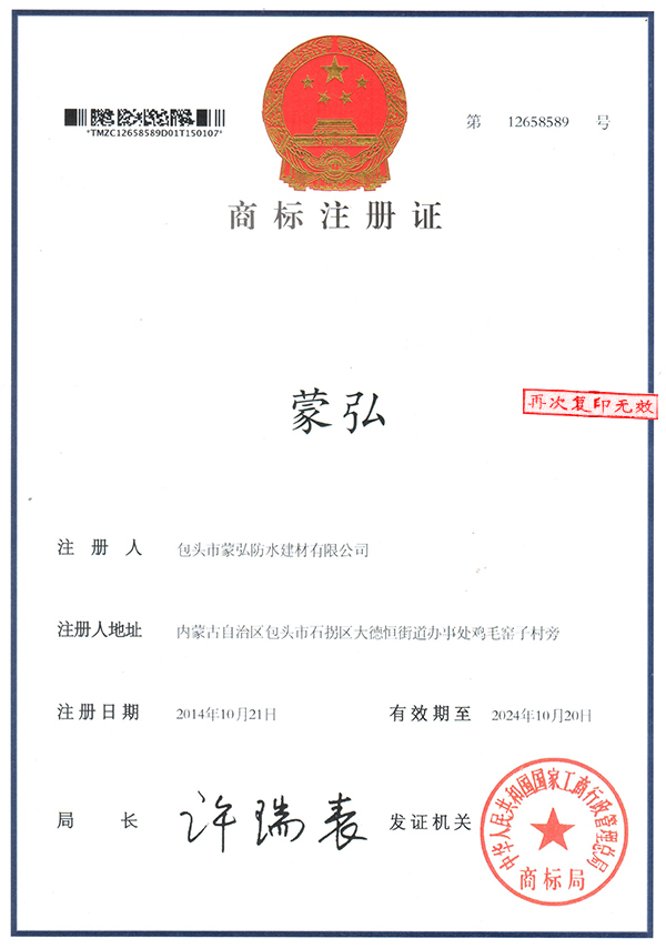 蒙弘防水建材商標(biāo)注冊(cè)證